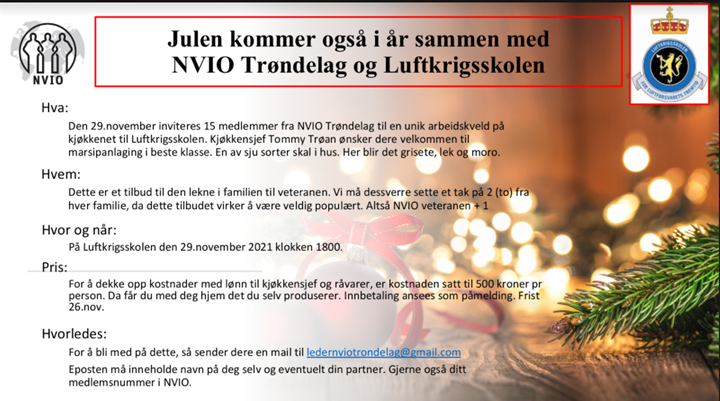 Den 29.november inviteres 15 medlemmer fra NVIO Trøndelag til en unik arbeidskveld på kjøkkenet til Luftkrigsskolen. Kjøkkensjef Tommy Trøan ønsker dere velkommen til marsipanlaging i beste klasse. En av sju sorter skal i hus. Her blir det grisete, lek og moro.